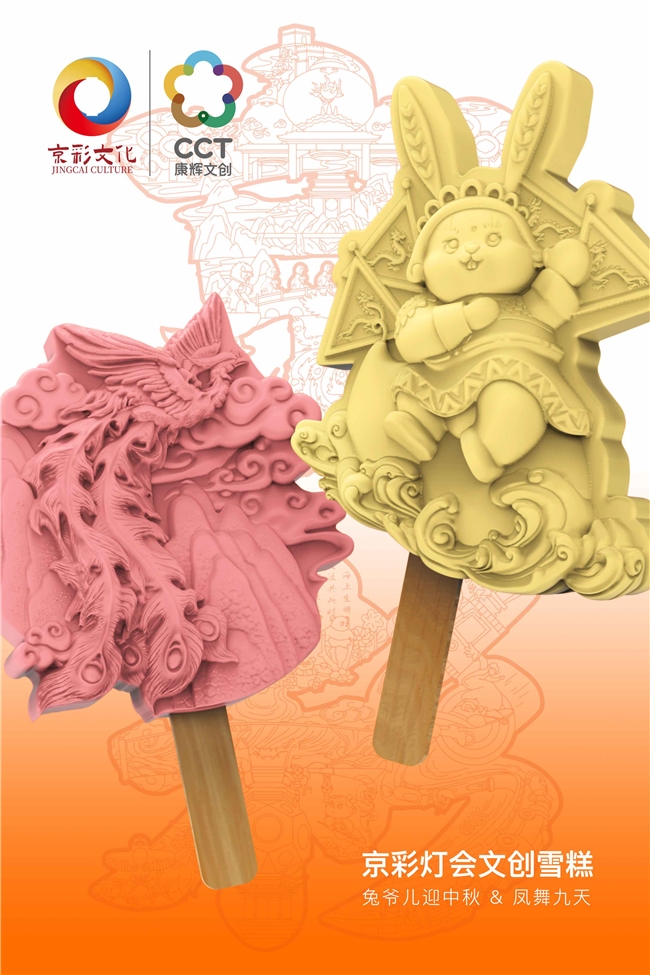燈會文創(chuàng)雪糕:造型1兔爺迎中秋——體現(xiàn)北京特色的非遺兔爺,配合京劇裝扮;造型2選自“鳳舞九天”燈組。