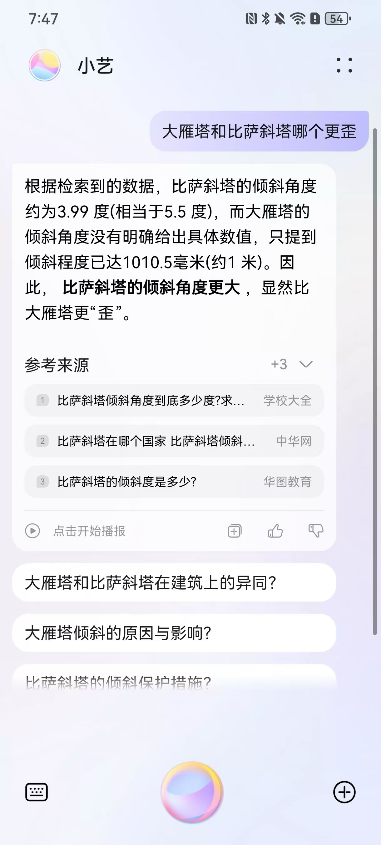 確定好目的地之后,到底怎么玩?對大多數(shù)人來說,既要規(guī)劃詳細(xì)、又要細(xì)節(jié)不出紕漏的“完美旅行攻略”非常費時費力。而小藝可以從特色景點、住宿、餐飲、注意事項等多個維度出發(fā),結(jié)合用戶確定的旅行目的地,為你解答各種旅行知識,堪稱旅行界的百科全書。用戶只需長按華為手機(jī)電源鍵或者對手機(jī)說“小藝小藝”即可喚醒小藝,不論是詢問當(dāng)?shù)氐娜宋闹R、歷史典故,還是推薦熱門景點、美食小吃,小藝都能對答如流,幫助大家更快速了解目的地的相關(guān)信息。比如你可以直接問它“為什么景德鎮(zhèn)的瓷器很出名”、大雁塔和比薩斜塔哪個更歪” “為什么很多人喝不慣北京豆汁兒”,通過各種問題逐漸了解到目的地的各種信息,幫助提升旅行體驗。