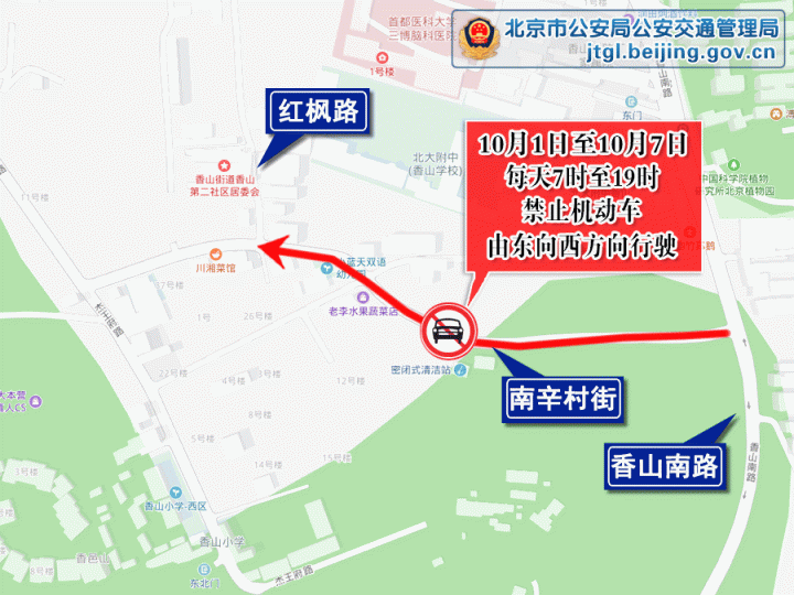 10月1日至10月7日,每天7時(shí)至19時(shí),海淀區(qū)南辛村街(紅楓路至香山南路段)禁止機(jī)動(dòng)車(chē)由東向西方向行駛。