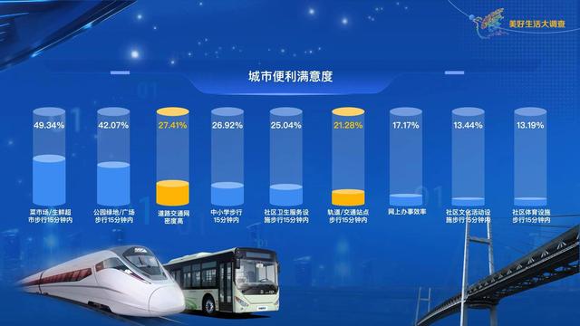 交通的改善大大提高了生活的便利度。其中,道路網(wǎng)密度高和軌道/交通站點(diǎn)步行15分鐘內(nèi)這兩項(xiàng)的滿意度都位居城市便利度方面的第二梯隊(duì)。