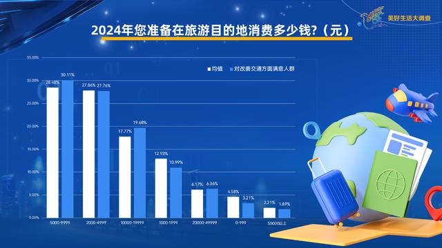 《美好生活大調(diào)查》發(fā)現(xiàn),對(duì)交通方面滿意人群,預(yù)計(jì)旅游消費(fèi)在5000至9999元和10000至19999元的占比都高出均值2個(gè)百分點(diǎn)。