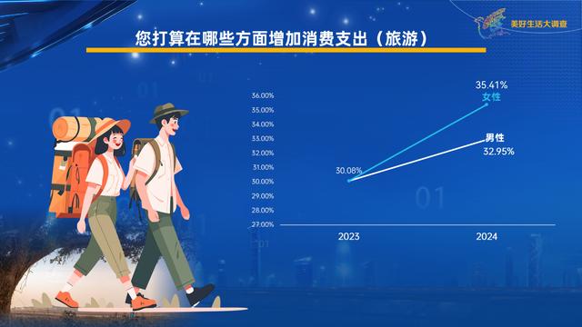 旅游大軍中,女性的出游意愿高漲。準(zhǔn)備今年在旅游方面增加消費(fèi)的女性占比較去年增加了5個(gè)百分點(diǎn),也比男性高出2個(gè)百分點(diǎn)以上,是2024年旅游消費(fèi)妥妥的“主力軍”。