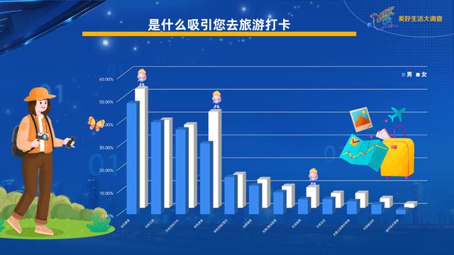《美好生活大調(diào)查》發(fā)現(xiàn),自然景觀是吸引大家去旅游打卡的最主要因素,有將近一半的人會(huì)因此選擇旅游目的地。名勝古跡、歷史民俗文化和特色美食緊隨其后。不同人群中,女性對(duì)城市的特色美食超級(jí)偏愛,因?yàn)樘厣朗橙ヒ粋(gè)城市旅游的女性占比高出男性11個(gè)百分點(diǎn)以上。跟女性相比,男性對(duì)名勝古跡和特色民宿/酒店更感興趣一點(diǎn)。