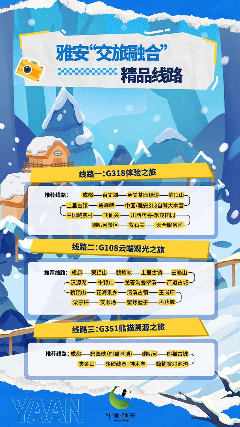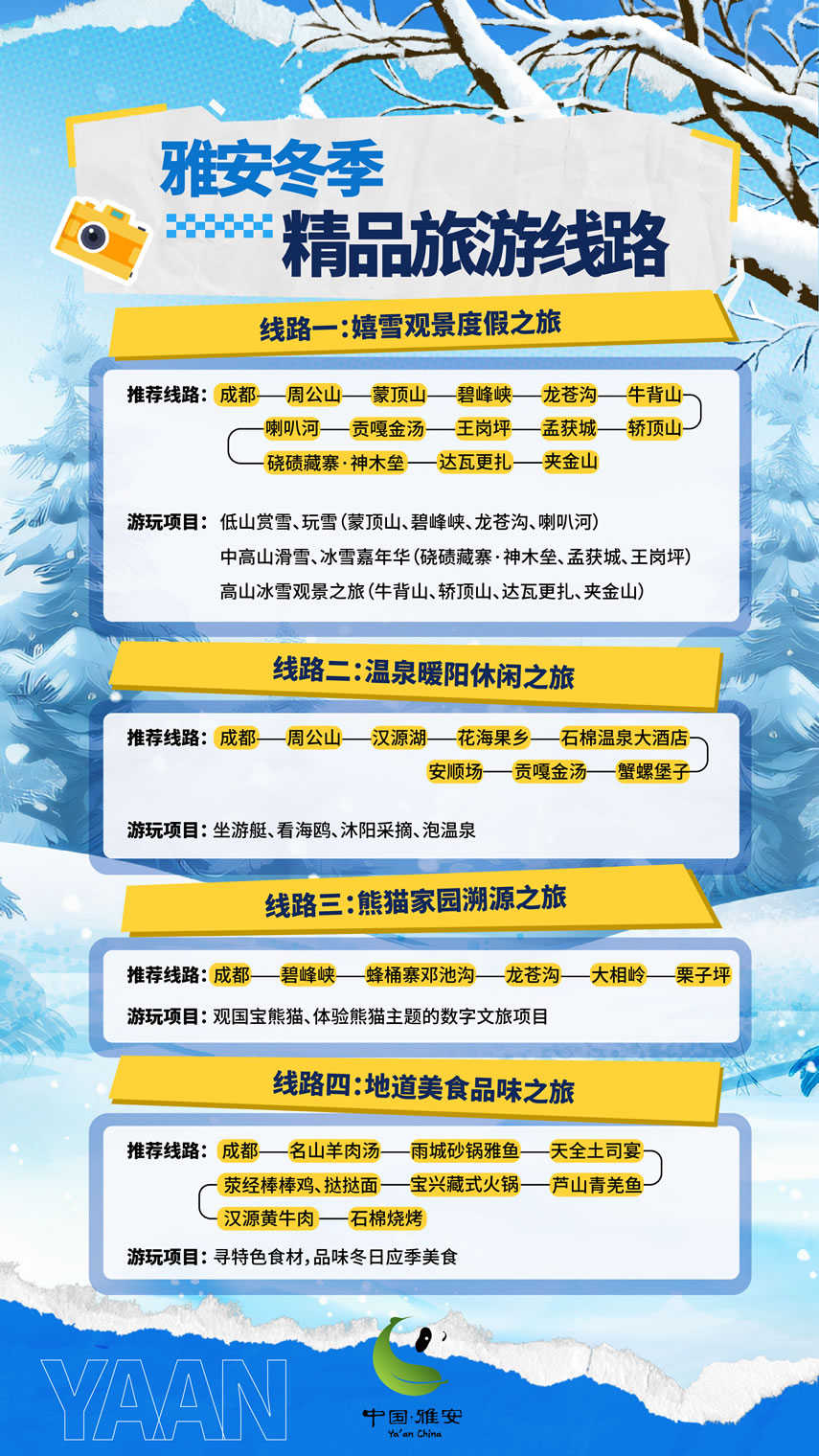 這個冬天,雅安市圍繞冰雪、溫泉、熊貓、美食,推出4條冬季精品旅游線路,圍繞國道318、108等交旅資源,推出3條“交旅融合”精品線路,最大程度滿足游客的冬游需求。將以冰雪為序,溫泉為媒,熊貓為邀,美食為禮,誠邀四方游客共赴一場難忘的旅行盛宴,邀請各地游客來“綠美雅安 熊貓家園”暢享冰天雪地的快樂,盡享溫泉暖陽的愜意,邂逅“風(fēng)花雪月”的故事。