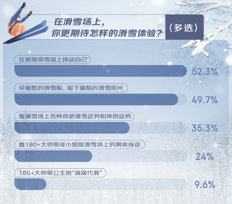 滑雪運(yùn)動(dòng)的持續(xù)“擴(kuò)圈”,也讓滑雪愛好者們對于滑雪體驗(yàn)的期待日益多元。超半數(shù)人希望在更高級的雪道上挑戰(zhàn)自我,感受速度與激情的碰撞;有49.7%的人期待穿上最酷的滑雪服,留下最炫的滑雪照片;還有24%的人表示來雪場期待看到帥哥、美女的颯爽滑雪身姿。