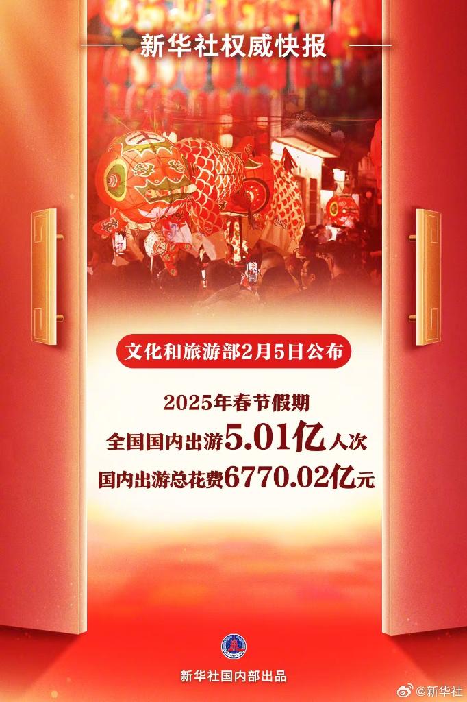 2月5日,文化和旅游部公布春節(jié)假期最新數(shù)據(jù):春節(jié)假期8天,全國國內出游5.01億人次,同比增長5.9%;國內出游總花費6770.02億元,同比增長7.0%。全國出游人次和總花費再創(chuàng)新高!
