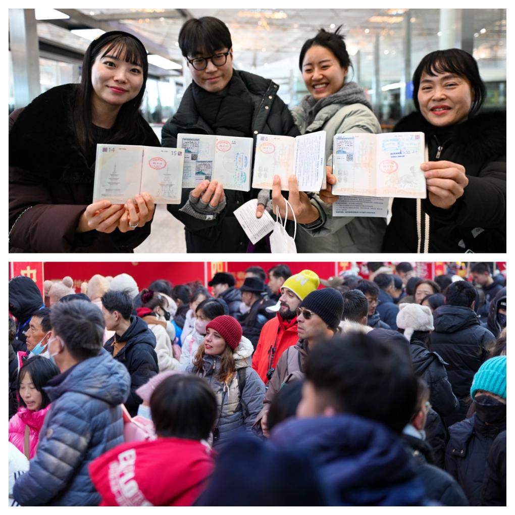 拼圖:(上圖)1月28日,在首都國際機場,四名韓國游客利用免簽政策來中國旅游,他們向記者展示著護照上的入境章。(下圖)1月29日,兩位來自西班牙的游客在北京地壇廟會游覽。