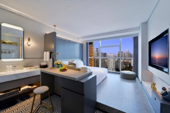客房哲學(xué):320間客房搭配全景落地窗設(shè)計,干濕分離設(shè)計搭配臨窗浴缸,申寶冷暖床墊實現(xiàn)“冬暖夏涼”智能溫控,高端雅蘭布草,細節(jié)處彰顯東方待客之道。