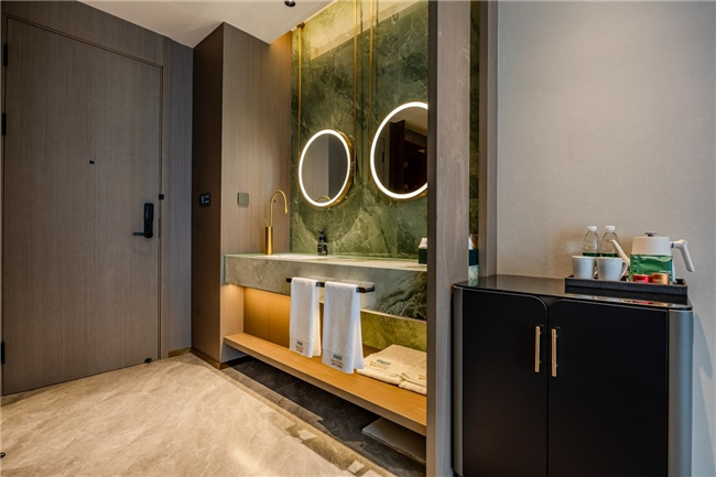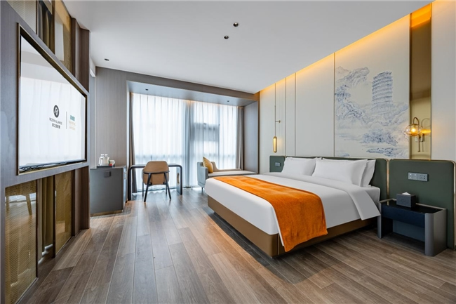 客房方面,酒店設(shè)有多元客房,涵蓋大床房、雙床房、家庭房及豪華套房,滿足不同客人的入住需求。房間內(nèi)配備全景落地窗、智能客控系統(tǒng)、電視投屏功能、品牌床墊、中央空調(diào)等設(shè)施一應(yīng)俱全,營造出舒適溫和的氛圍,讓客人在淡泊素雅的藝術(shù)氣息中,感受到 "酒店不只是一張床,更是路上最溫暖的港灣,是在繁華喧鬧中回歸自我的慢生活"。