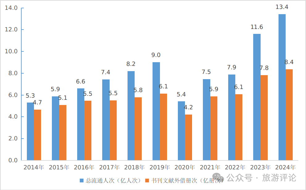 2014—2024年全國(guó)公共圖書(shū)館總流通人次及書(shū)刊外借冊(cè)次