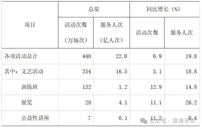 全年全國(guó)群眾文化機(jī)構(gòu)共組織開(kāi)展各類(lèi)文化活動(dòng)440萬(wàn)場(chǎng),同比增長(zhǎng)6.9%;服務(wù)22億人次,同比增長(zhǎng)19.8%!