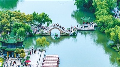 隨著“蘇超”破圈,江蘇揚(yáng)州借勢發(fā)力,推出“看球+賞景”文旅套餐,圖為游客在瘦西湖風(fēng)景區(qū)賞景游玩。