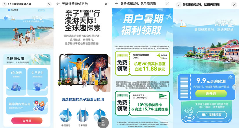 暑期,天際通為計(jì)劃出境游的用戶特別推出了“全球隨心用”活動,境外流量9.9元包天,每天有5GB高速流量,活動覆蓋港澳、新馬泰、日韓、歐洲、澳大利亞、美國(本土地區(qū))等50個國家地區(qū),多重優(yōu)惠讓境外出行更劃算。華為天際通還為出行亞洲、歐洲的用戶提供了多地旅游優(yōu)惠權(quán)益,涵蓋機(jī)票酒店、旅游景點(diǎn)、吃喝玩樂等各個方面,更多精彩等你來發(fā)現(xiàn)!