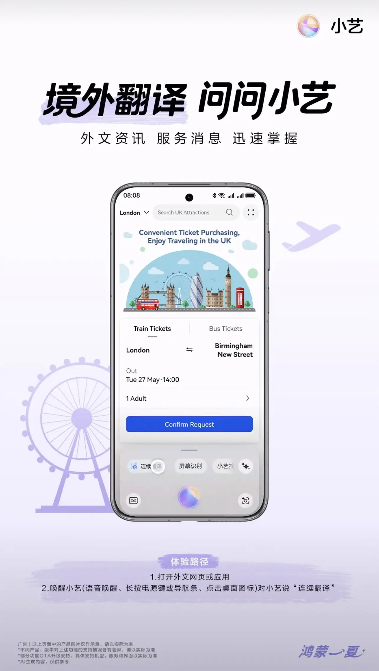 出境游線上點(diǎn)餐、使用本地應(yīng)用或?yàn)g覽網(wǎng)站時,外文語言不通常常成為攔路虎。升級鴻蒙5的用戶可以用小藝“連續(xù)翻譯”功能解決。長按小藝導(dǎo)航條,點(diǎn)擊“連續(xù)翻譯”服務(wù)即可體驗(yàn),一次開啟就能實(shí)現(xiàn)屏內(nèi)邊瀏覽邊翻譯的系統(tǒng)級連續(xù)翻譯體驗(yàn),支持截屏、文檔、瀏覽器等全場景的連續(xù)性翻譯。如果是面對面點(diǎn)餐、問路等場景,也可以跟小藝說“小藝翻譯助手”,該翻譯Agent提供文本翻譯、同聲傳譯、面對面翻譯功能,讓出境游無障礙溝通。