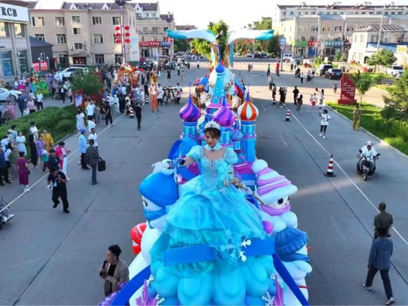 巡游隊(duì)伍中,47名專業(yè)演員的表演同樣精彩紛呈。“金翎飛霄”方陣的男演員們身著女真武士鎧甲,手持長矛跳起剛勁有力的戰(zhàn)舞;“鐘林毓秀”方陣的女演員則化身森林精靈,輕盈的舞步配合著花車上搖曳的藍(lán)莓枝椏,演繹出林間仙境的唯美畫面。演員們還不時(shí)走下花車與觀眾互動,教小朋友模仿鄂倫春族的傳統(tǒng)舞蹈動作,現(xiàn)場笑聲不斷。