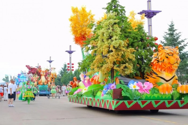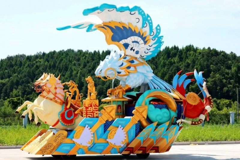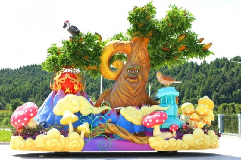 花車設(shè)計(jì)不僅注重視覺沖擊力,更融入動態(tài)特效:虎頭擺動、翅膀扇動、雪花機(jī)噴灑等細(xì)節(jié),讓靜態(tài)的造型煥發(fā)生命力。夜幕降臨時(shí),花車更以夜光效果點(diǎn)亮林海,為觀眾呈現(xiàn)一場光影交織的奇幻盛宴。