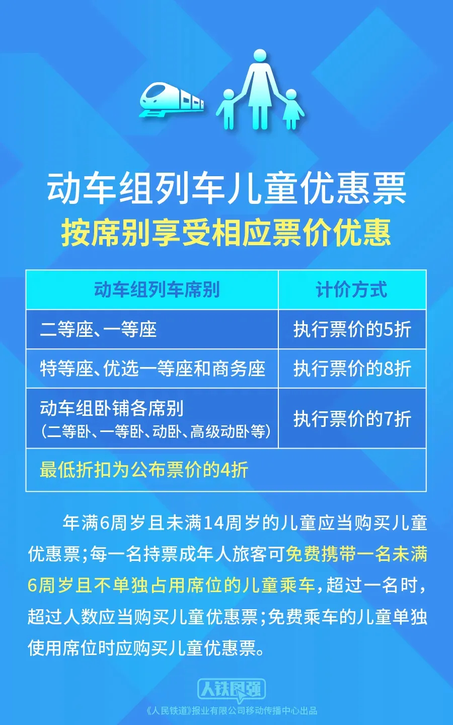 殘疾軍人、傷殘人民警察、殘疾消防救援人員等憑有效證件,動車組各席別優(yōu)待票價按“執(zhí)行票價的5折”方式計價,最低折扣為公布票價的4折。