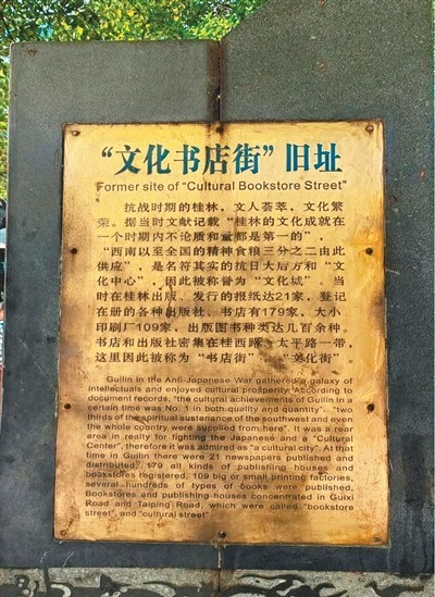 位于桂林市中心的解放西街,一座“文化書店街”舊址紀(jì)念碑在街角靜靜矗立。抗戰(zhàn)時(shí)期,這條街道曾有過另一個(gè)名字:桂西路。