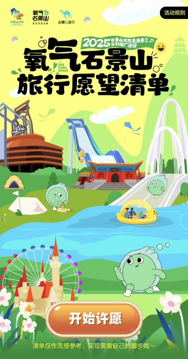 在“去哪兒”旅行APP上線“氧氣石景山”文旅專題頁,不僅整合酒店榜單、景區(qū)門票、優(yōu)質(zhì)攻略等核心文旅資源,更特別設(shè)置石景山區(qū)對口支援和協(xié)作地文旅產(chǎn)品版塊,實現(xiàn)“石景山推廣+支援地區(qū)助銷”雙重價值。同步推出的“旅行打卡愿望清單”H5,線上用戶可點亮自己的石景山旅游心愿,生成專屬旅行愿望清單;在高校路演活動中,大學生可分享H5到社交媒體作為參與活動的入場券——既為高;顒宇A熱,更成為高校路演入場憑證,串聯(lián)起“線上互動-線下參與”的閉環(huán)。