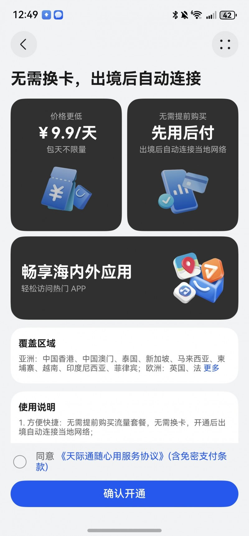 緊接著,天際通第二重禮·隨心用——9.9元/天多地流量隨心用,針對(duì)多地旅行或深度游用戶,天際通推出「9.9元/天多地流量隨心用」服務(wù),用戶無需換卡,支持先用后付,按需付費(fèi)。每24小時(shí)僅需9.9元,享5GB高速流量+常速不限量,覆蓋歐美、東南亞等50個(gè)熱門地區(qū);單次開通長期有效,不用不扣費(fèi),聯(lián)程轉(zhuǎn)機(jī)無縫銜接。