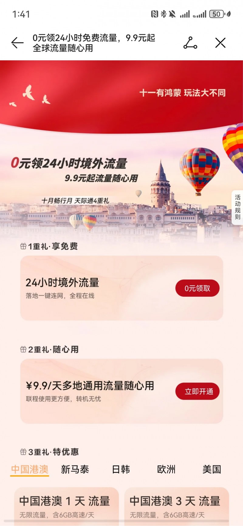 國慶長假將至,出境游熱度飆升,9月17日至10月31日,華為天際通「十月暢行月」福利活動(dòng)開啟,推出4重超值禮遇,從免費(fèi)流量、按天計(jì)費(fèi)到本地權(quán)益全覆蓋,讓用戶真正實(shí)現(xiàn)說走就走,暢行無憂。