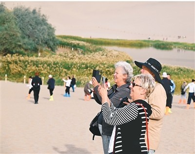外國游客在甘肅省鳴沙山月牙泉景區(qū)游覽拍照。