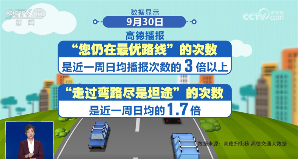 我們再來看一個有趣的數(shù)據(jù)。“雖然前方擁堵,但您仍在最優(yōu)路線上”“今天走過了所有彎路,從此人生盡是坦途”,高德導(dǎo)航的“勸堵”金句與長假出行實時相伴。數(shù)據(jù)顯示,9月30日,高德播報“您仍在最優(yōu)路線”的次數(shù)是近一周日均播報次數(shù)的3倍以上,播報“走過彎路盡是坦途”的次數(shù)是近一周日均的1.7倍,可見自駕出行的人越來越多。不過,也有重慶網(wǎng)友表示“扎心”,“走過彎路還是彎路,坦途這句等我開出重慶再說。”