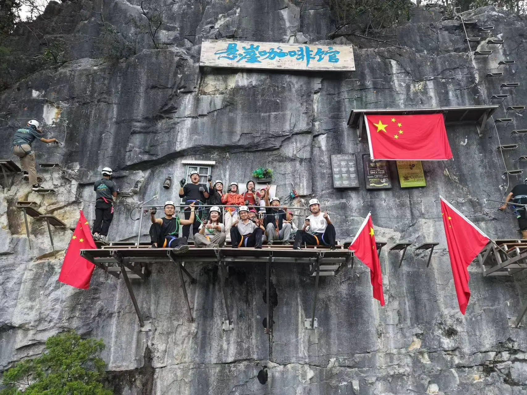在距離地面200米的崖壁上喝上一杯咖啡,也是酷玩森林最受歡迎的項(xiàng)目之一。游客佩戴專(zhuān)業(yè)登山裝備,在教練陪同下沿固定路線攀登至懸崖中段的休息平臺(tái)。站在平臺(tái)上,山川云海盡收眼底,隨手拍都是 “朋友圈大片”,刺激又出片。
