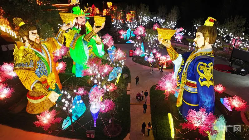 “快看,涿水女神在眨眼!”孩童驚呼引來眾人駐足。運(yùn)用動(dòng)態(tài)LED技術(shù),絹紗背后的女神眼眸流轉(zhuǎn),讓古老傳說瞬間鮮活。12米的“桃園三結(jié)義”燈組搭配實(shí)景情景劇,讓“三國演義從涿州開篇”的故事跳出書本。盧植、酈道元等先賢燈廊下,游客們借著暖光,細(xì)細(xì)品讀他們的生平,風(fēng)過廊下,燈影輕搖,宛如歷史在耳邊回響。