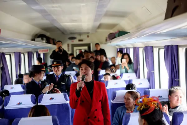 火車上,《和田是個好地方》《新疆姑娘》《祝福祖國亞克西》等經(jīng)典文藝節(jié)目輪番上演,悠揚的旋律和深情的演唱打動著在場的每一位旅客,讓車廂成為流動的舞臺。文藝表演結束后,文旅資源宣傳推介環(huán)節(jié)緊隨其后,工作人員通過生動講解與展示,帶領旅客提前領略和田的獨特風光與人文魅力。此外,宣講人員還用接地氣的家常話、互動感十足的小問答,把理論知識講得鮮活有趣,讓旅客們在旅途的碎片時光里,既能放松休憩,又能輕松收獲思想啟迪,讓出行多了一份別樣的“精神補給”。