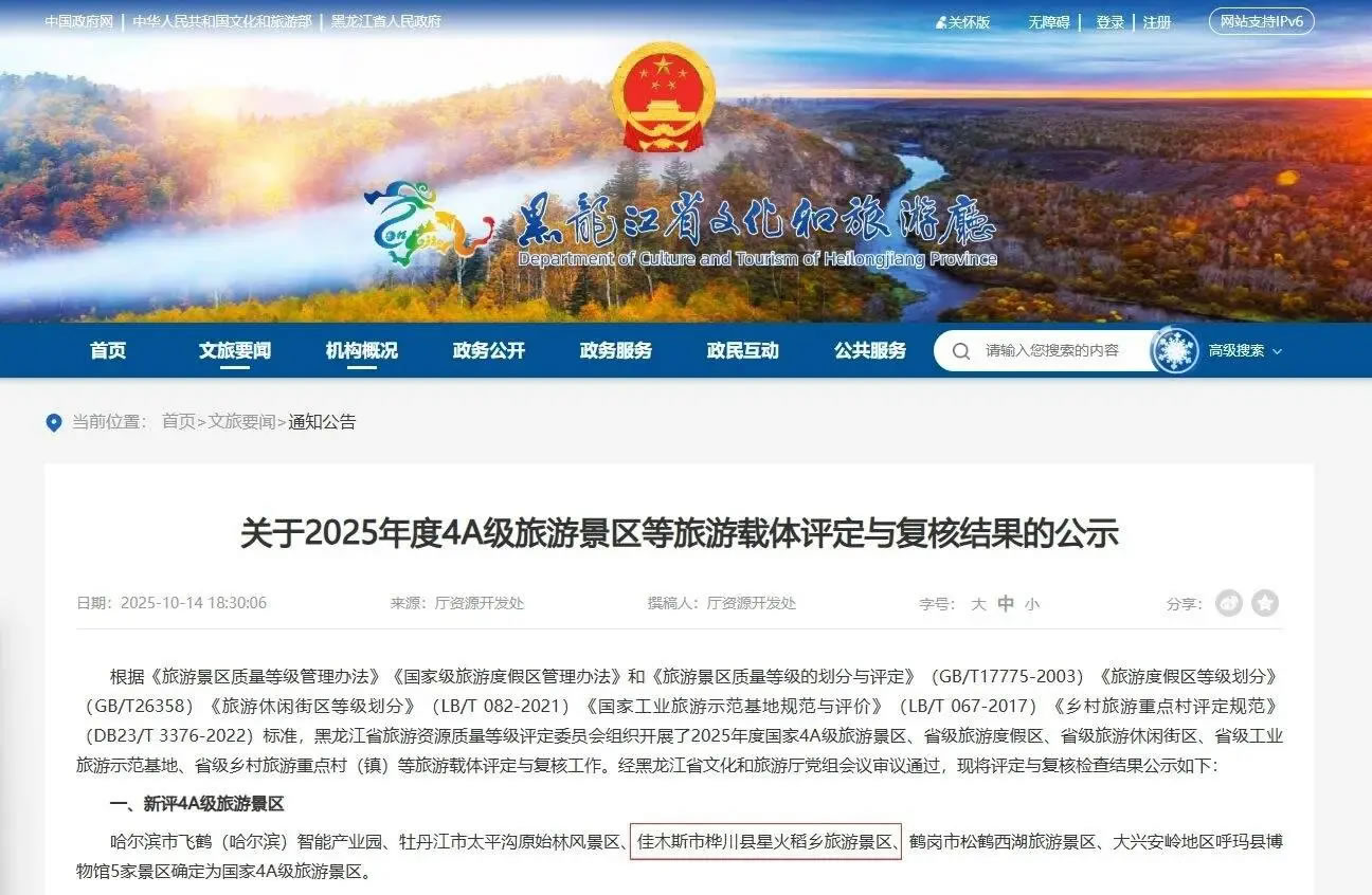 近日,黑龍江省文化和旅游廳發(fā)布2025年度AAAA級(jí)旅游景區(qū)評(píng)定與復(fù)核結(jié)果公示,樺川縣星火稻鄉(xiāng)旅游景區(qū)成功躋身國家AAAA級(jí)旅游景區(qū)行列。