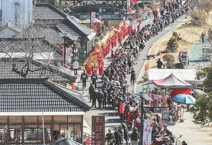 長街宴不僅是味蕾的盛宴,更是一場傳統(tǒng)文化的嘉年華。與美食相伴的是氣勢如虹的舞龍隊、古樸熱鬧的中馬燈巡游、精彩的舞獅表演,在大山村,殺年豬的傳統(tǒng)儀式、虎虎生風的少兒武術(shù)、靈動活潑的小馬燈、喜慶昂揚的舞蹈等節(jié)目輪番上演,生動呈現(xiàn)了高淳非遺民俗的獨特魅力。