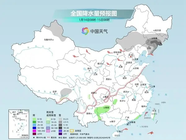 明天,內蒙古中部、黑龍江南部、吉林、遼寧中東部、新疆北部、西藏東北部、河北北部等地部分地區(qū)有小雪或雨夾雪,其中,吉林中南部、遼寧北部和東部等地部分地區(qū)有中到大雪,吉林東部局地有暴雪。湖南西部、貴州中南部、云南東部、廣東東南部沿海、臺灣島東部等地部分地區(qū)有小雨。