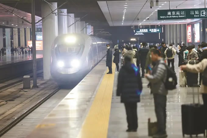 從1月26日零時(shí)起,全國鐵路實(shí)行新的列車運(yùn)行圖,調(diào)圖后,圖定旅客列車較原圖增加243列。京滬高鐵標(biāo)桿列車G25次迎來了“瘦身”升級(jí):這趟京滬間最快高鐵取消原有5個(gè)?空,僅設(shè)南京南站唯一經(jīng)停點(diǎn)。圖為當(dāng)日晚,旅客在南京南站準(zhǔn)備乘坐G25次列車。(陳儼 攝)
