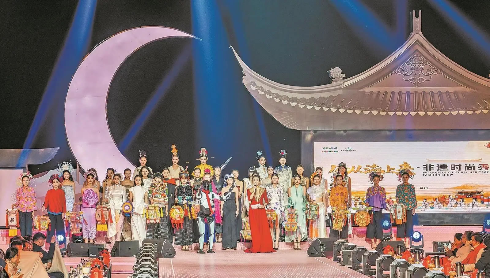 時(shí)尚秀分上、下兩篇。開(kāi)場(chǎng)展示宋代迎客禮儀,還原宋人風(fēng)雅。上篇“海上生明月”以生活化的“海”為主線,通過(guò)《月娘月光光》表演唱、南音《庭院七弦響》、情景表演《海的女兒》等節(jié)目,融合惠安女織網(wǎng)、蟳埔女簪花、茶道香道等非遺元素,搭配模特走秀,展現(xiàn)人與海的和諧共生。下篇“匠心映月輝”以非遺技藝的“匠”為核心,國(guó)潮樂(lè)隊(duì)《奇跡》、南少林武術(shù)《少林雄風(fēng)》、民間舞蹈《雙鐵尺舞》等節(jié)目,將非遺技藝與現(xiàn)代設(shè)計(jì)結(jié)合,凸顯力與美的碰撞。尾聲,全體模特手持花燈、瓷器等非遺作品返場(chǎng),與歌曲《泉州人》共鳴,寓意“燈火萬(wàn)家明”,點(diǎn)亮泉州夜空。