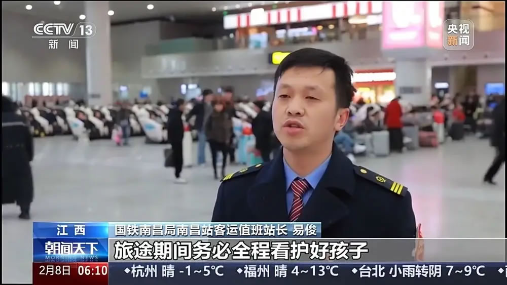 國鐵南昌局南昌站客運值班站長 易俊:旅途期間務必全程看護好孩子,切勿讓孩子脫離視線。如需幫助,可聯系車站工作人員和民警,謹防孩子走失、接觸陌生人員。