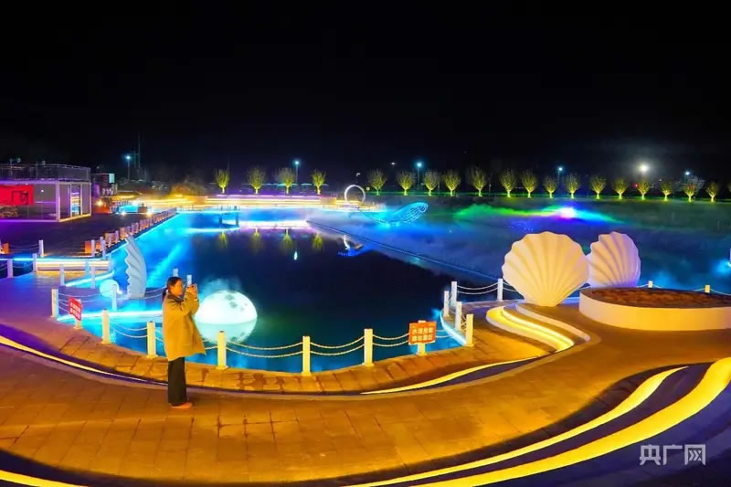記者在現(xiàn)場看到,技術(shù)人員正緊張調(diào)試投影設(shè)備,水幕自湖面徐徐升起,畫面仿佛從水中“生長”而出。春節(jié)期間,整片尖山湖將化身天然巨幕,沉浸式水幕電影每晚準(zhǔn)時上演,激光、水霧、音效完美交融,帶來震撼視聽體驗(yàn)。
