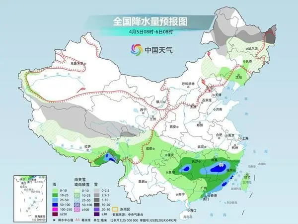 中央氣象臺(tái)預(yù)計(jì),4月5日,內(nèi)蒙古東部、東北地區(qū)中北部、西藏西部和北部、青海南部、川西高原北部等地部分地區(qū)有小雪或雨夾雪,其中,內(nèi)蒙古東北部、黑龍江中北部、川西高原北部等地部分地區(qū)有中到大雪。西藏東南部、江南中南部、廣東中東部等地部分地區(qū)有中到大雨,其中,西藏東南部、湖南西部、江西中南部、福建西部和東南部沿海等地部分地區(qū)有暴雨。