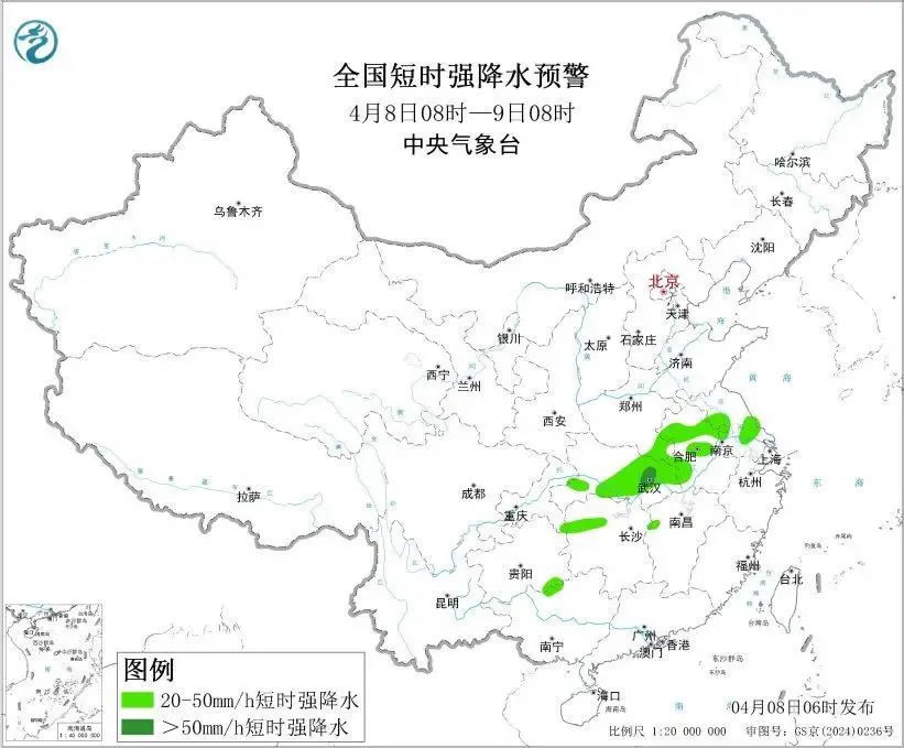 預計,4月8日8時至9日8時,湖北南部和東部、安徽中北部、河南南部、江蘇中北部等地部分地區(qū)有大到暴雨,其中,湖北東部局地有大暴雨(100~150毫米)。上述部分地區(qū)伴有短時強降水(最大小時降雨量20~40毫米,局地可超過50毫米),局地有雷暴大風或冰雹等強對流天氣。