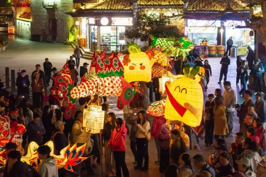 夜色漫進(jìn)安徽省黃山市宏村,青石板路被燈火慢慢照亮。兔子燈、蓮花燈、蘿卜燈……各種手工扎制的燈盞隨著游客在巷道里緩緩游走,粉墻黛瓦襯著暖黃燈光,仿佛穿越回了古徽州。