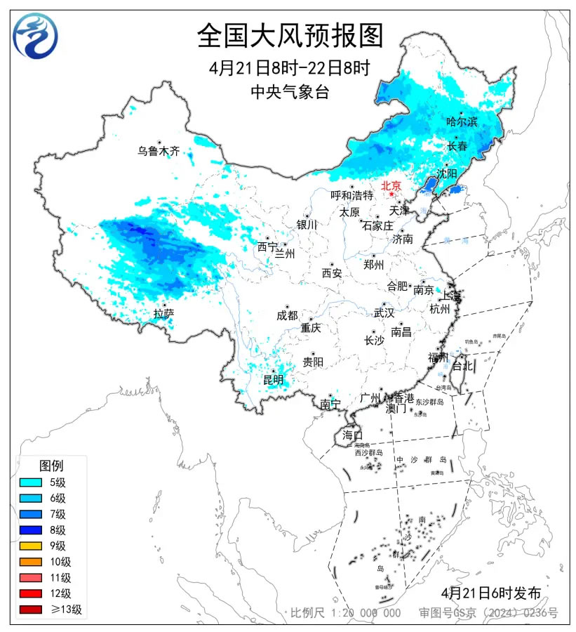 大風(fēng)藍(lán)色預(yù)警:預(yù)計(jì),4月21日8時(shí)至22日8時(shí),內(nèi)蒙古中東部、黑龍江中南部、吉林、遼寧以及新疆南疆盆地、西藏北部、青海西部等地部分地區(qū)有5~7級(jí)風(fēng),陣風(fēng)8~9級(jí),渤海北部海域、黃海北部海域?qū)⒂?級(jí)、陣風(fēng)8級(jí)的風(fēng)。