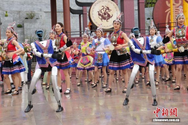 機器人與表演者一起跳畬族舞蹈。傅飛揚 攝