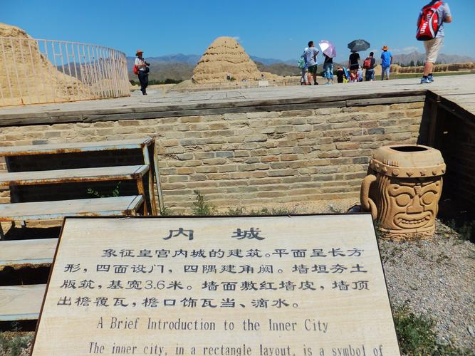 月城北側(cè)為內(nèi)城遺址,四面用神墻環(huán)繞,呈南北長(zhǎng)方形,南北長(zhǎng)180米,東西寬160米。占地約40畝。神墻中部較窄,靠近轉(zhuǎn)角漸寬大,純凈黃土分段夯筑而成,中部每段約3米,殘高約3米,比較平齊,各段如須彌座形狀。神墻四處轉(zhuǎn)角皆很高大,類(lèi)圓柱形,從各轉(zhuǎn)角往神墻兩側(cè),連體圓柱愈來(lái)愈矮小,各有5個(gè),共40個(gè)。其殘存最高達(dá)6米以上,最低的3米,發(fā)現(xiàn)在轉(zhuǎn)角處5個(gè)連體圓柱夯土臺(tái)周?chē)杂写u瓦殘存。內(nèi)城四面神墻皆正中辟門(mén),門(mén)址寬約12米,地面散布瓦片、脊飾殘塊等。根據(jù)統(tǒng)計(jì),內(nèi)城坍塌墻體在2002年時(shí)已達(dá)189.1米,約占?jí)w總長(zhǎng)度的27.8%。南神門(mén)內(nèi)約25米偏西處有一處獻(xiàn)殿遺址。根據(jù)考古發(fā)掘情況看,可能原為一正方形臺(tái)基,臺(tái)面周長(zhǎng)65米,直徑約20米,堆積厚約1米。臺(tái)基以純凈黃土墊起,其上及周?chē)鷼埓娲罅壳啻u灰瓦及琉璃構(gòu)件。獻(xiàn)殿之后約6米為墓道封土,南北長(zhǎng)約42米,呈東南——西北走向,形似魚(yú)脊,以砂石填充。其末端為盜坑,盜坑直徑約20米,深約5米。坑內(nèi)長(zhǎng)有若干小樹(shù),兩側(cè)有土堆。內(nèi)城西北隅有一處陵臺(tái),八角形,高約20米,分7級(jí),每級(jí)向內(nèi)收分。陵臺(tái)收分處及周?chē)孛嫔⒉即罅客咂⑼弋?dāng)、滴水等建筑材料。夯土臺(tái)整體形狀為塔形,其上露出一個(gè)個(gè)椽洞,有水平方向的,還有豎斜方向的,證明原來(lái)有椽出頭。距離陵臺(tái)較遠(yuǎn)的四角各有一座角臺(tái),其中東南、西南的兩座角臺(tái)已坍塌,西南角尚可分辨認(rèn)出臺(tái)基,相距約520米。其連線在雙闕臺(tái)之前,北面的2座角臺(tái)相距290米。東北角臺(tái)殘高1米多,坍塌嚴(yán)重,只有西北處的角臺(tái)保存比較完好,殘高約5米,但嚴(yán)重風(fēng)化。北邊兩角臺(tái)相距272米。南北聯(lián)線約460米。夯土臺(tái)因剝蝕已趨圓柱形,底面周長(zhǎng)20米。純凈黃土夯筑,周?chē)⒙渲罅考t褐色板瓦、筒瓦殘片。