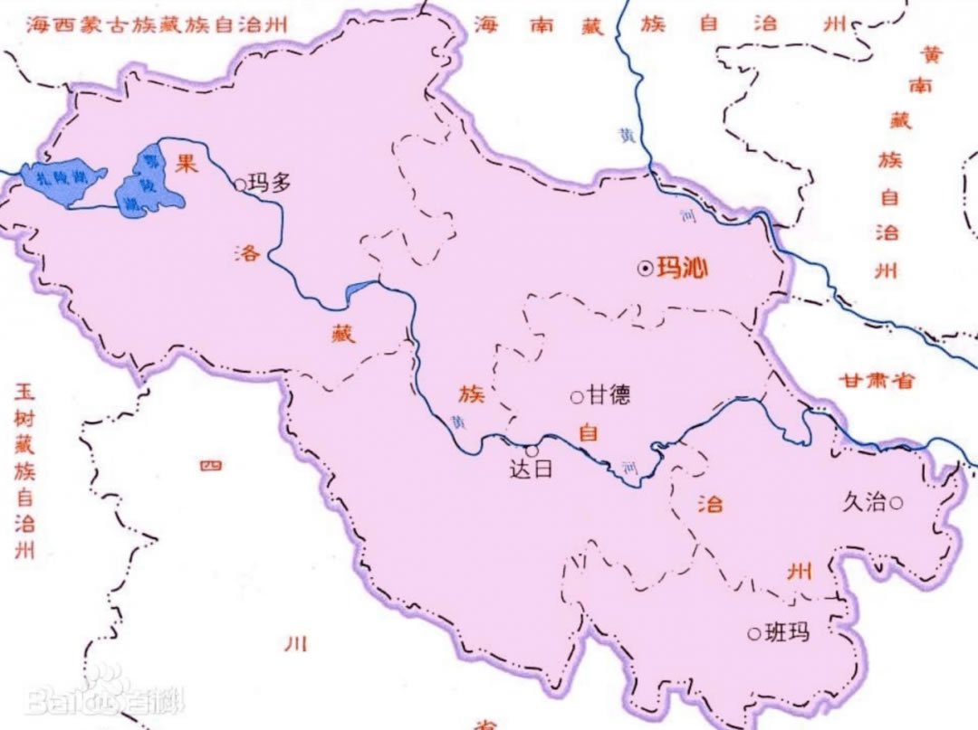 1957年,由甘德縣部分地區(qū)設(shè)瑪多縣,駐黃河沿;由達(dá)日、甘德2縣部分地區(qū)合并設(shè)瑪沁縣,駐中心站(依蓋齊);果洛藏族自治州轄6縣。