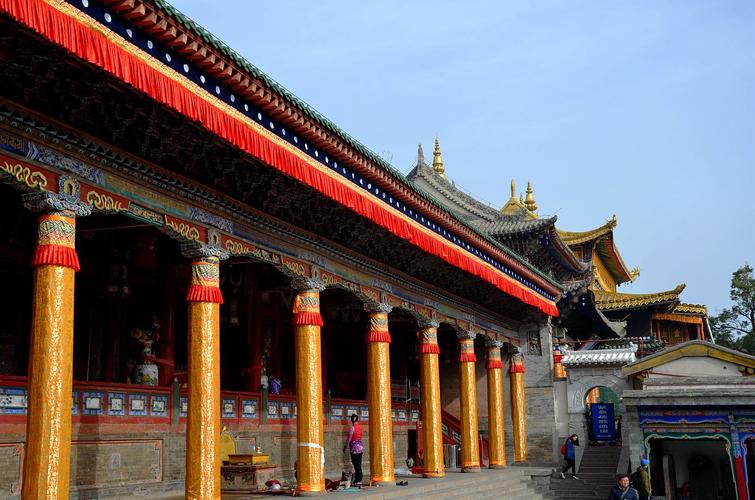 又稱文殊菩薩殿,為漢式硬山頂建筑,面闊九間,進深三間,面積592平方米。初建于明萬歷二十年(公元1592年),清雍正十二年(公元1734年)擴建。廊柱為藏式朱色八楞柱。整座大殿以三間為一單元,由北向南分別為獅子吼佛殿、文殊殿和宗喀巴殿;ㄋ掠址Q祈壽殿,建于清康熙五十六年(公元1717年),系一獨立的小庭院,殿為兩層重檐歇山頂建筑。柱頭梁枋都飾以飛禽、走獸、花卉、文紋,院墻飾琉璃磚雕。殿內(nèi)供奉釋迦牟尼、十六羅漢和四大金剛等塑像。