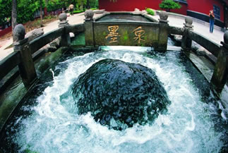 為濟(jì)南七十二名泉之一。位于百脈泉公園龍泉寺西南側(cè),泉池呈方形,漢白玉雕砌,正常年流量0.3立米/秒。泉孔黝深,水色蒼蒼如墨而得名。泉眼直徑0.4米,泉水騰涌而出,水清透明,泉水黝深,故名“墨泉”。墨泉水出自深部奧陶紀(jì)石灰?guī)r巖溶裂隙,盛水期泉流量0.5立方/秒,水柱沖出泉口,聲如雷鳴,雪濤飛濺。注入石渠,浩浩而下,有“一泉成河”的美譽。泉池前后刻“墨泉”二字,為大書法家舒同先生題寫。字體方正渾厚,“頗具魏晉飄逸之氣,含篆籀之義理,得分隸之謹(jǐn)嚴(yán)”,墨泉所在位置1966年-1980年曾是章丘縣委家屬住院,時任章丘縣委書記的舒同先生居此。