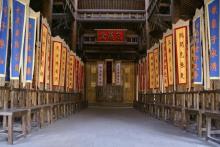 忠義堂院落里,中央是一根朱紅色的旗桿,上面懸掛著一面杏黃旗,-“替天行道”四個黑色大字。忠義堂前的平臺兩側,又有兩桿粉色的大旗,東面的旗幟上是“山東呼保義”,西邊懸掛的是“河北玉麒麟”。