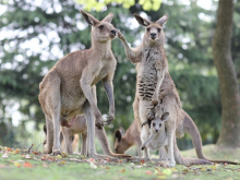 袋鼠是澳大利亞的國獸,有著獨特的育兒方式,袋鼠習慣用后肢跳躍前進,時速可達60公里。袋鼠坡草坪上的灰大袋鼠、赤大袋鼠組群生活,它們性格溫順。
