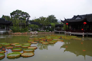 沿戲鵝池往東走,戲鵝池的北面是一三面臨水船型建筑,為石舫,又名不系舟,建于明代。原為園主的書畫舫,前艙后樓,花窗曲檻,艄樓高聳,有祝允明題額"不系舟"三字。后遭毀壞,由清代名醫(yī)和鴻舫重題,舟上有清末進(jìn)士廖壽豐撰書的一副對(duì)聯(lián):“十分春水比檐影;百葉蓮花七里香!