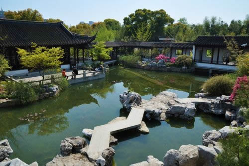 古猗園位于上海市西北郊嘉定區(qū)南翔鎮(zhèn)東,離市中心21公里。園林正門向南朝向滬宜公路,西近南翔老街、云翔寺,北聯(lián)滬嘉公路,占地面積130余畝。始建于明嘉靖年間,原名“猗園”,取自《詩經(jīng)》中“綠竹猗猗”一句。清乾隆十一年(1746年),更名“古猗園”。為上海五大古典園林之一。全園布局,主要由四面環(huán)水的兩塊島地組成。以五座平橋與兩岸連通,以一座曲橋使兩島相接。劃分為逸野堂、戲鵝池、松鶴園、青清園、鴛鴦湖、南翔壁6個(gè)景區(qū),是上海最古老的攬勝之一。